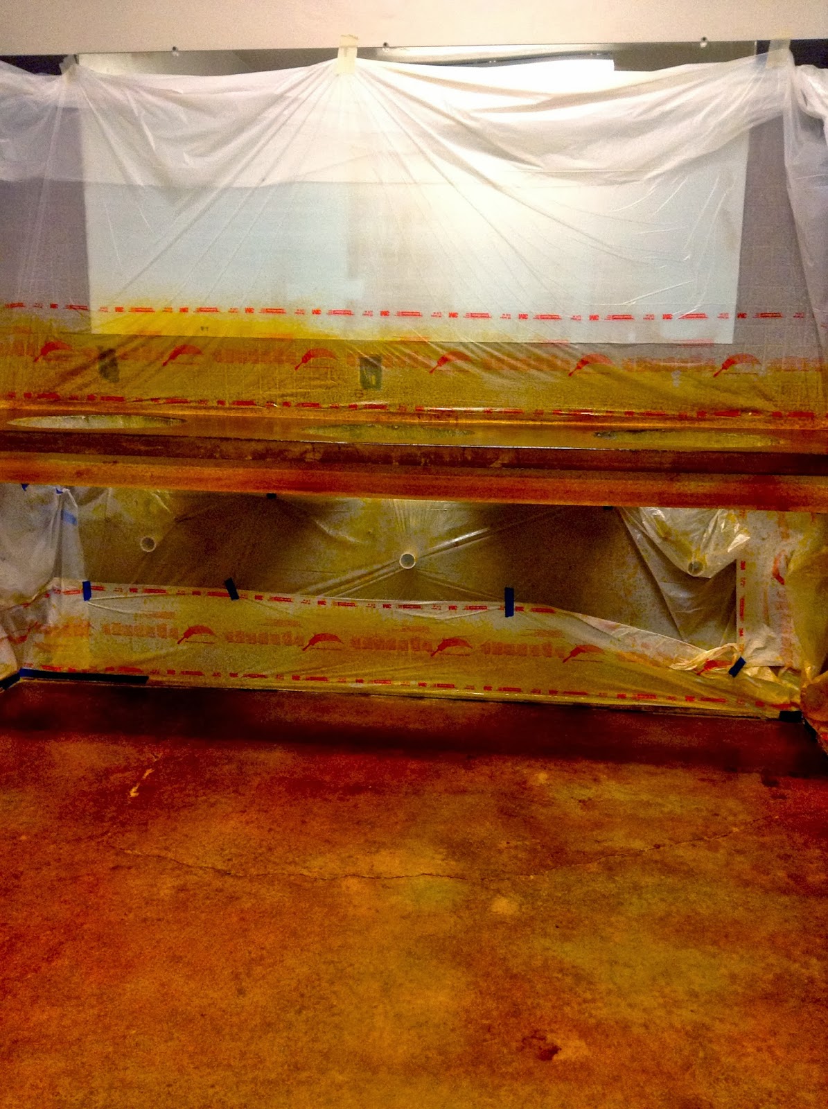 The first thing that Amanda, Sarah, and Crystal did was team up with Jen and Molly and removed all of the plastic covering the walls in the Trapline Lodge. That plastic was there because Karol stained the floors in the now "Bobcat Room".